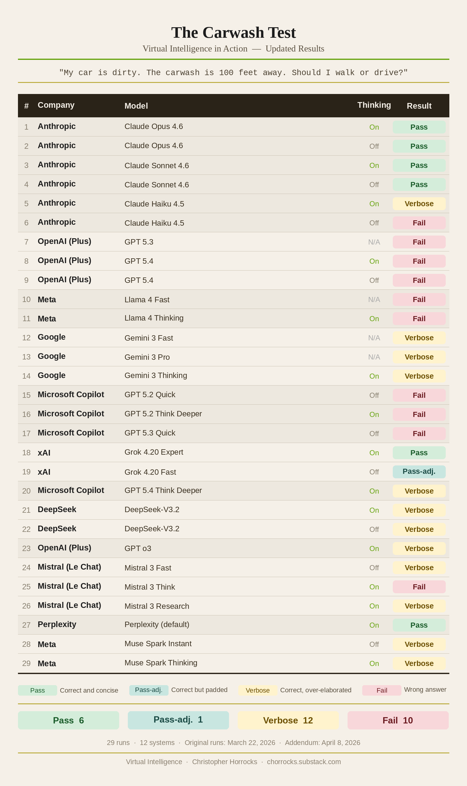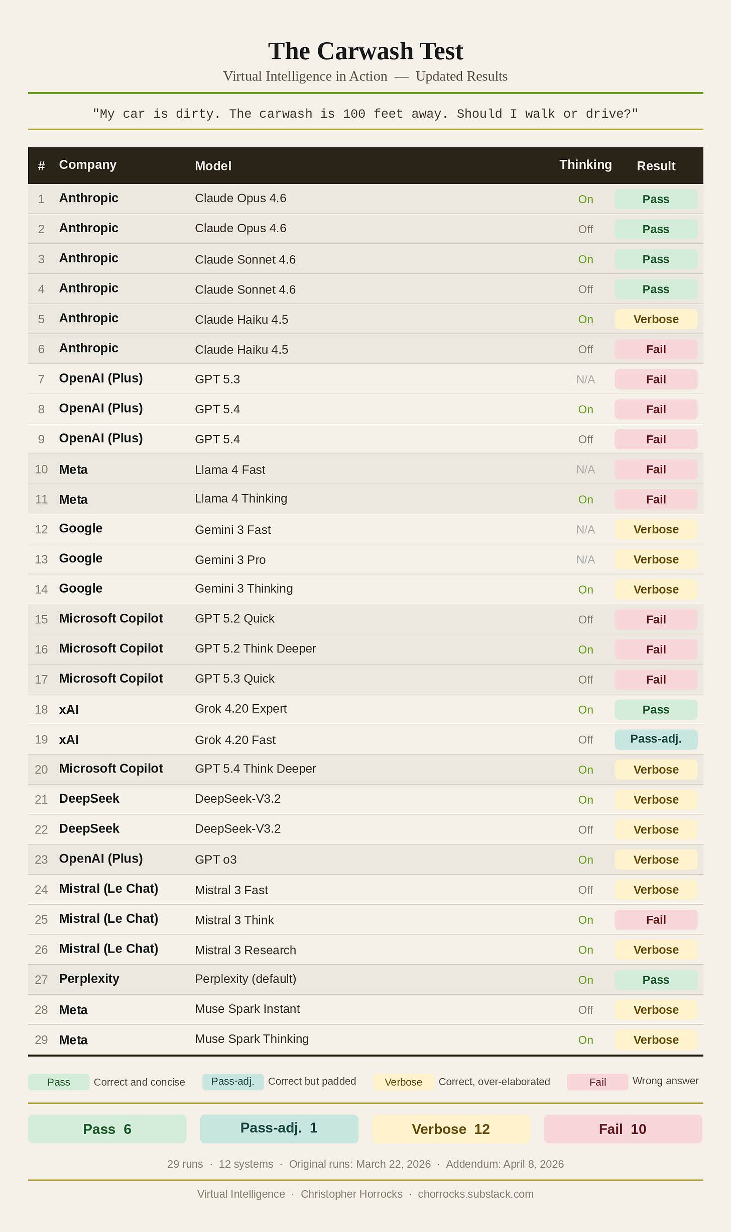 Twenty tests were conducted on March 22, 2026, using a single unmodified prompt: "My car is dirty. The carwash is 100 feet away. Should I walk or drive?" Each system received the prompt cold, in a fresh session, with no prior context. Seven additional tests were conducted on March 28, 2026, under identical conditions. Models tested: Claude Opus 4.6 and Sonnet 4.6 (Anthropic, each run with extended thinking on and off); Claude Haiku 4.5 (Anthropic, extended thinking on and off); ChatGPT 5.3 and 5.4 (OpenAI Plus, with and without extended thinking where available); GPT o3 (OpenAI Plus, extended thinking on); Meta AI / Llama 4 in fast and thinking modes; Gemini 3 in Fast, Pro, and Thinking tiers (Google, free browser); Grok 4.20 in Expert and Fast modes (xAI); Microsoft Copilot running GPT 5.2 Think Deeper, GPT 5.3 Quick, and GPT 5.4 Think Deeper; DeepSeek-V3.2 with and without extended reasoning; Mistral 3 in Fast, Think, and Research modes (Le Chat); and Perplexity in its default configuration. Copilot and the ChatGPT variants share the same underlying GPT architecture; their failures are not independent data points but a single architectural failure with two deployment surfaces, which the results bear out. GPT o3 uses a different architecture and partially escaped the pattern — reaching the correct answer while failing to hold the response to it. Results were scored Pass (correct and concise), Verbose (correct but over-elaborated), or Fail (wrong answer). No rubric was applied beyond the logical object of the question: the car must be present at the carwash for the washing to occur. Across twenty-seven runs, seven passed, ten were correct but verbose, and ten failed outright.